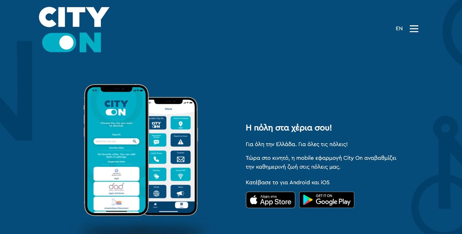 Την φετινή χρονιά πάνω από 15 Δήμοι έχουν εγκαταστήσει την Mobile Εφαρμογή “City On”, με περισσότερους από 3000 μοναδικούς χρήστες. Μάθε περισσότερα: https://cityon.gr/